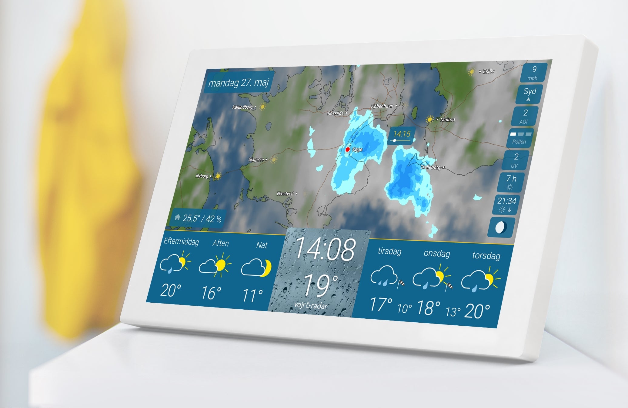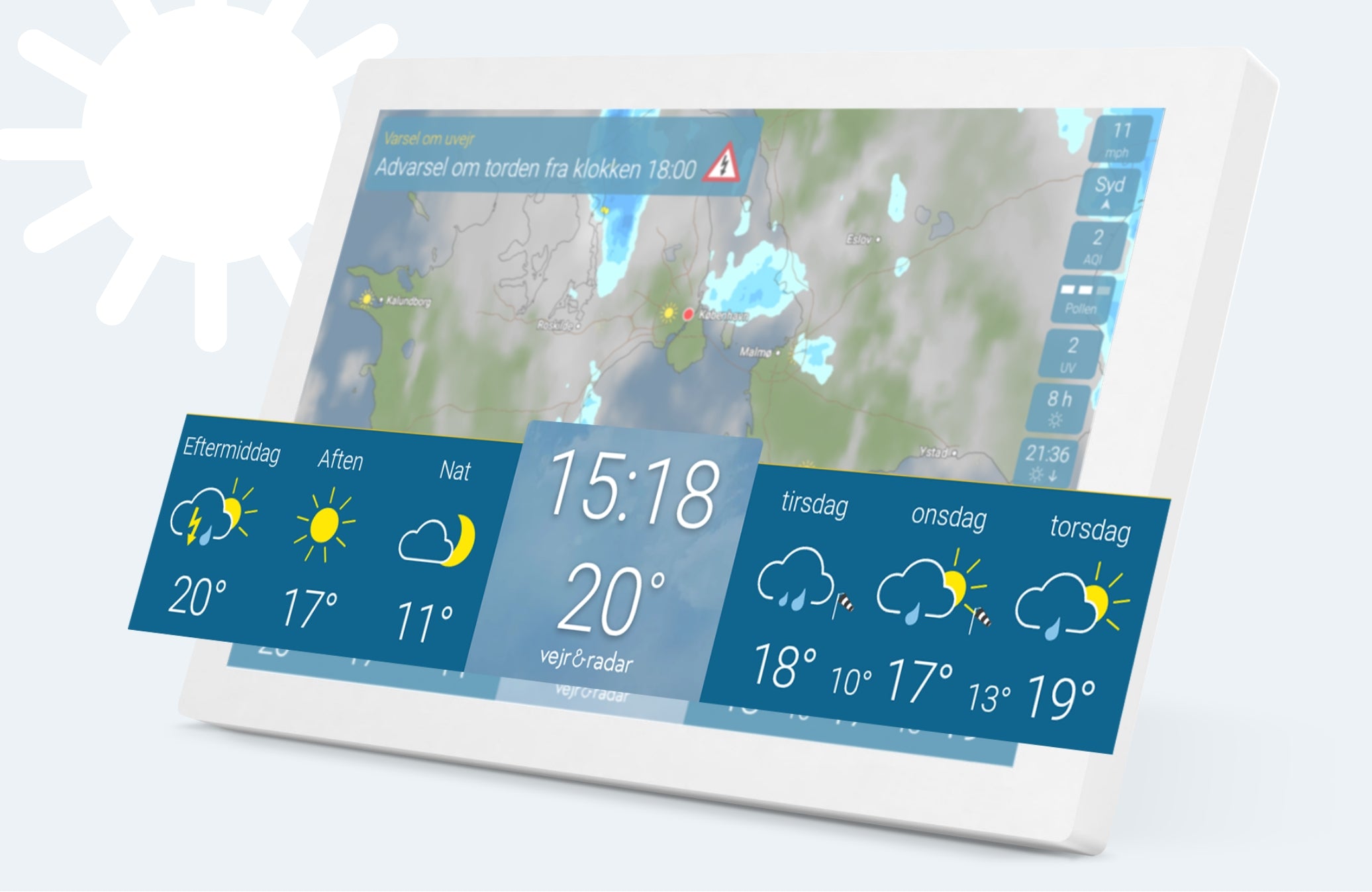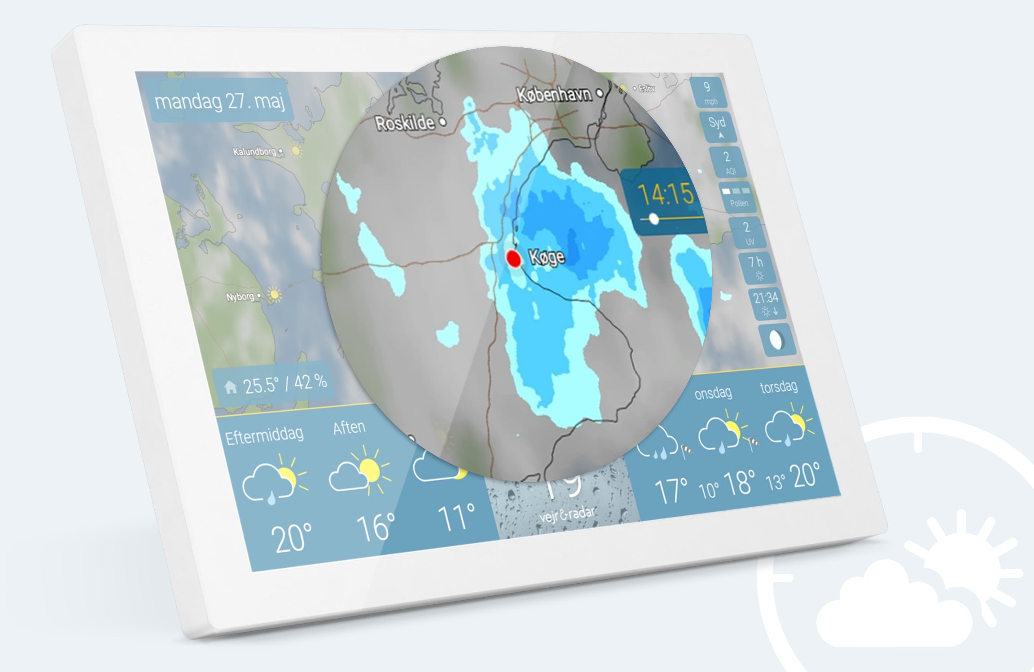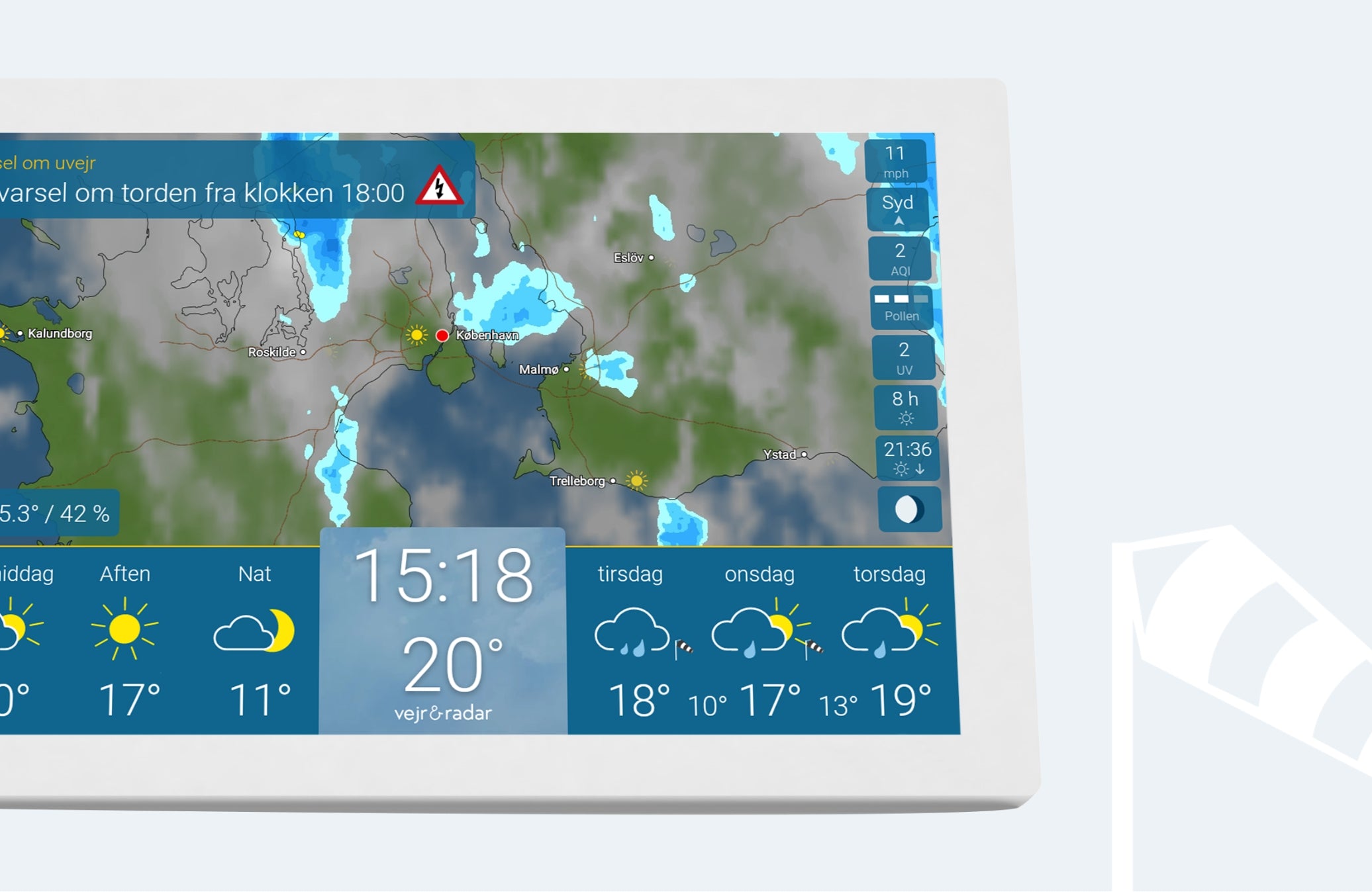 På et HD-display viser enheden oplysninger om det aktuelle vejr for et sted, der er bestemt ved hjælp af lokaliseringstjenester. Med VejrRadaren kan du følge vejret live i de næste 90 minutter. Zoom ind for at få flere detaljer, eller zoom ud for at se, hvordan vejret vil udvikle sig i fremtiden. VejrTrend viser vejrudsigten for i dag og de næste par dage. Vejrstationen advarer om voldsomt vejr. Du kan også vælge yderligere vejrinformation efter behov.