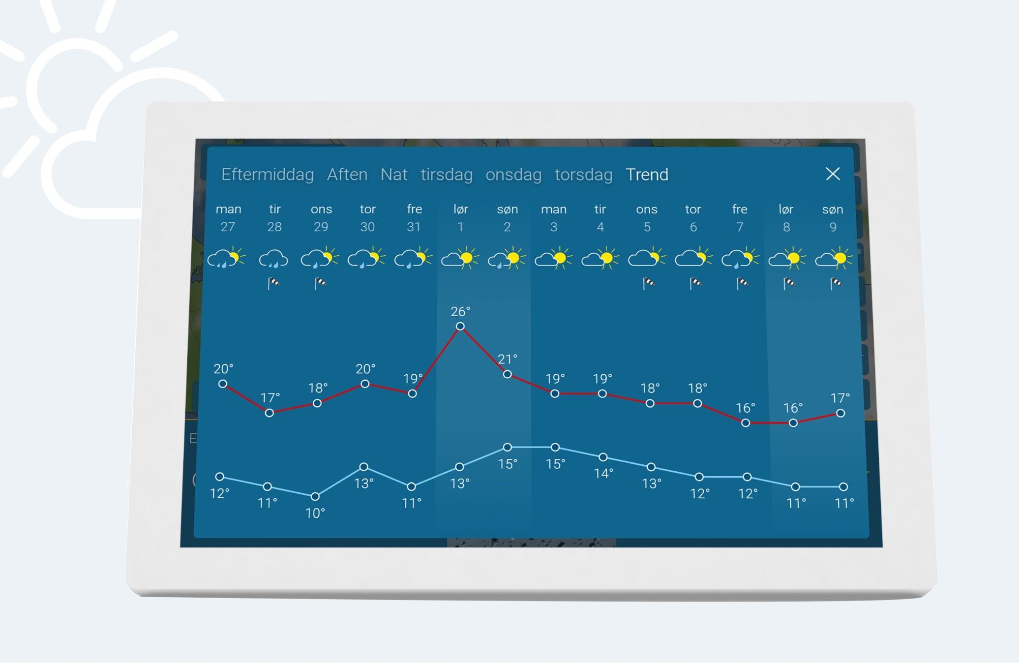 Hvis du trykker på menupunktet "Trend" i intervalvisningen af prognosedagen, vil du se vejrtendensen for de næste 14 dage med temperaturudvikling.
