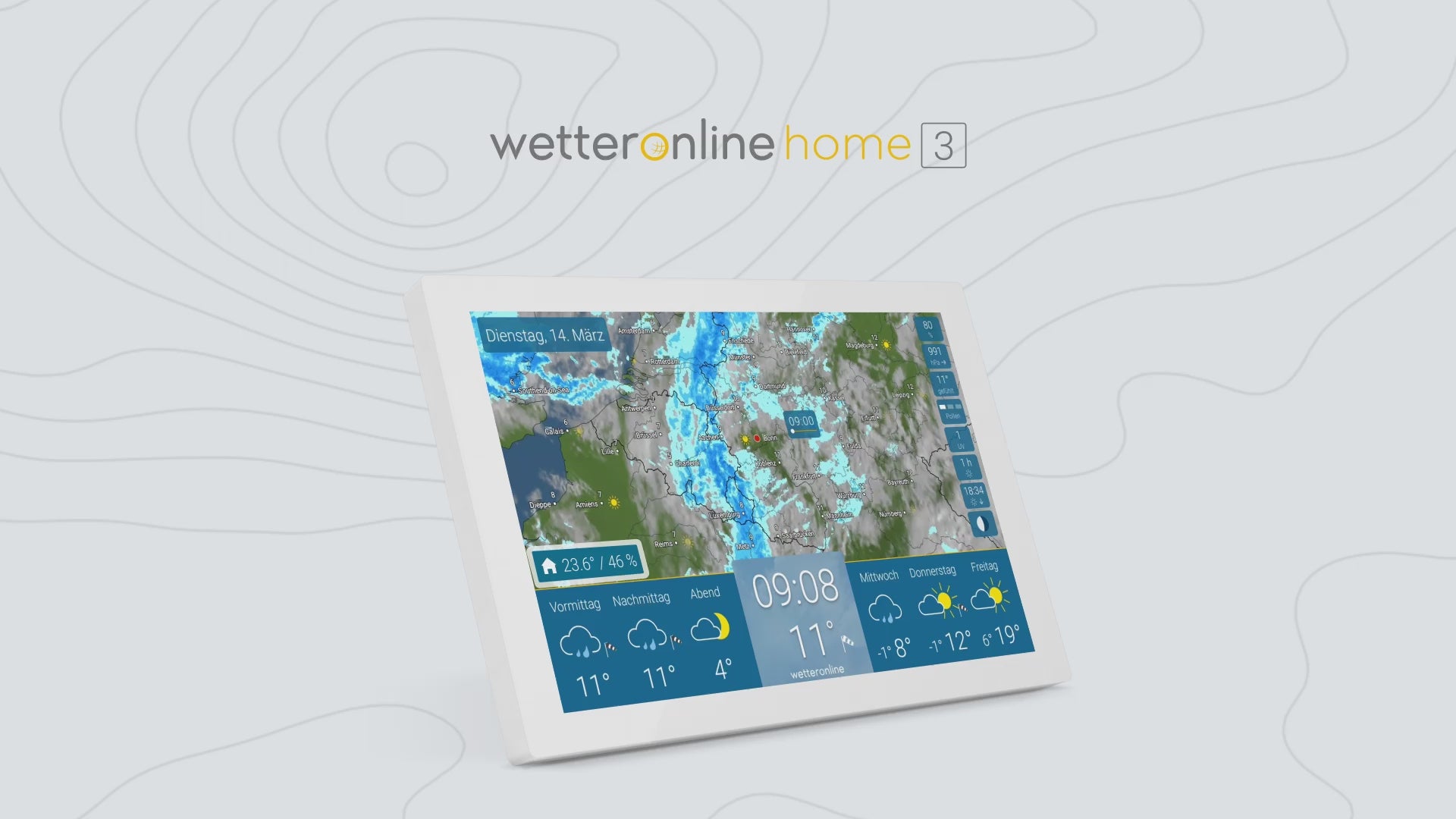 You put weather & radar home 3 into operation by connecting the device to the power supply. The program will then guide you step by step through the setup process. Once the location has been determined automatically, the weather for your location is displayed immediately. Choose from one of 15 languages in which weather & radar home 3 presents the weather: German, English, French, Dutch, Danish, Spanish, Italian, Portuguese, Polish, Czech, Slovakian, Slovenian, Hungarian, Romanian and Bulgarian.