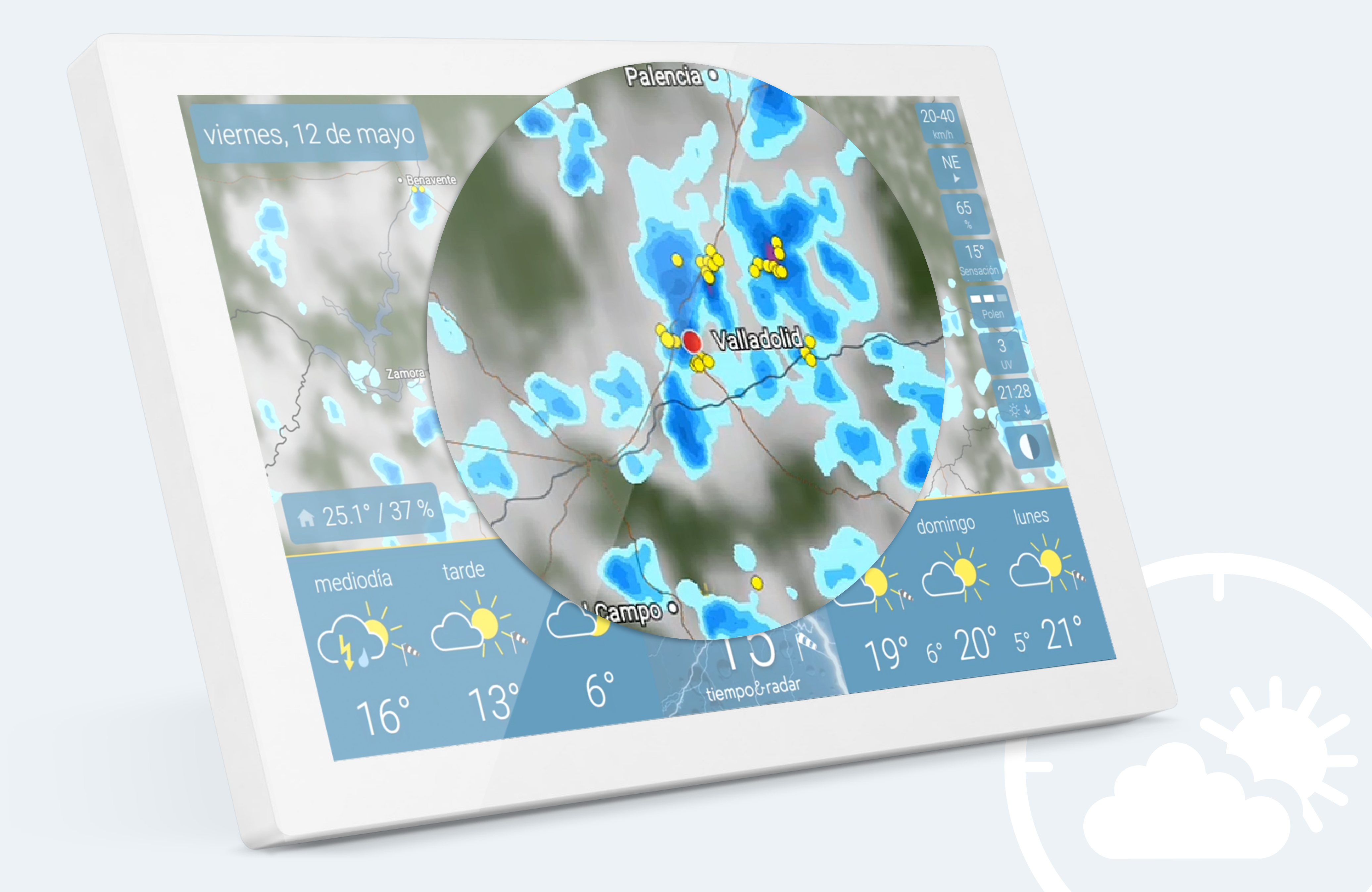 El dispositivo muestra información sobre las condiciones meteorológicas actuales en un lugar determinado mediante localización en una pantalla HD en una presentación sencilla y clara. Con el radar es fácil y sencillo seguir el tiempo en directo durante los próximos 90 minutos. Se puede acercar la imagen para obtener más detalles o alejarla para ver cómo irá evolucionando el tiempo.La Tendencia meteorológica la previsión meteorológica para hoy y los próximos días,