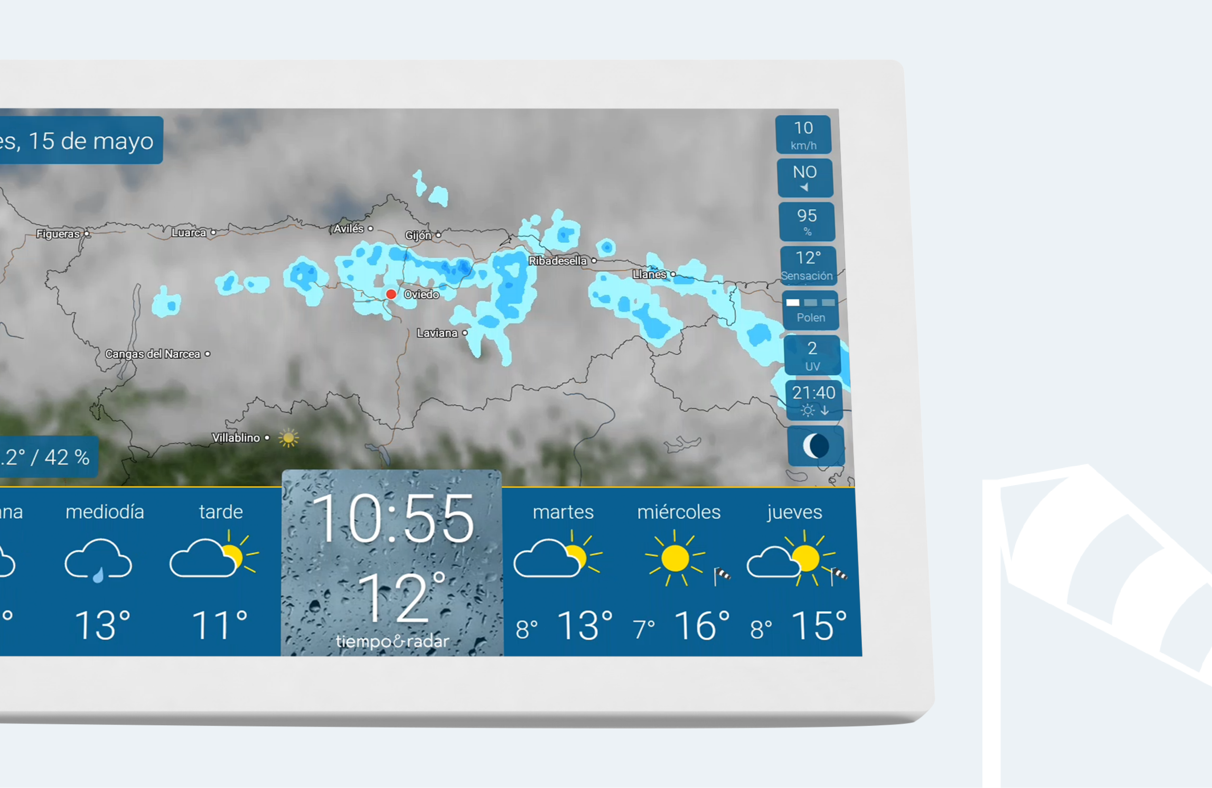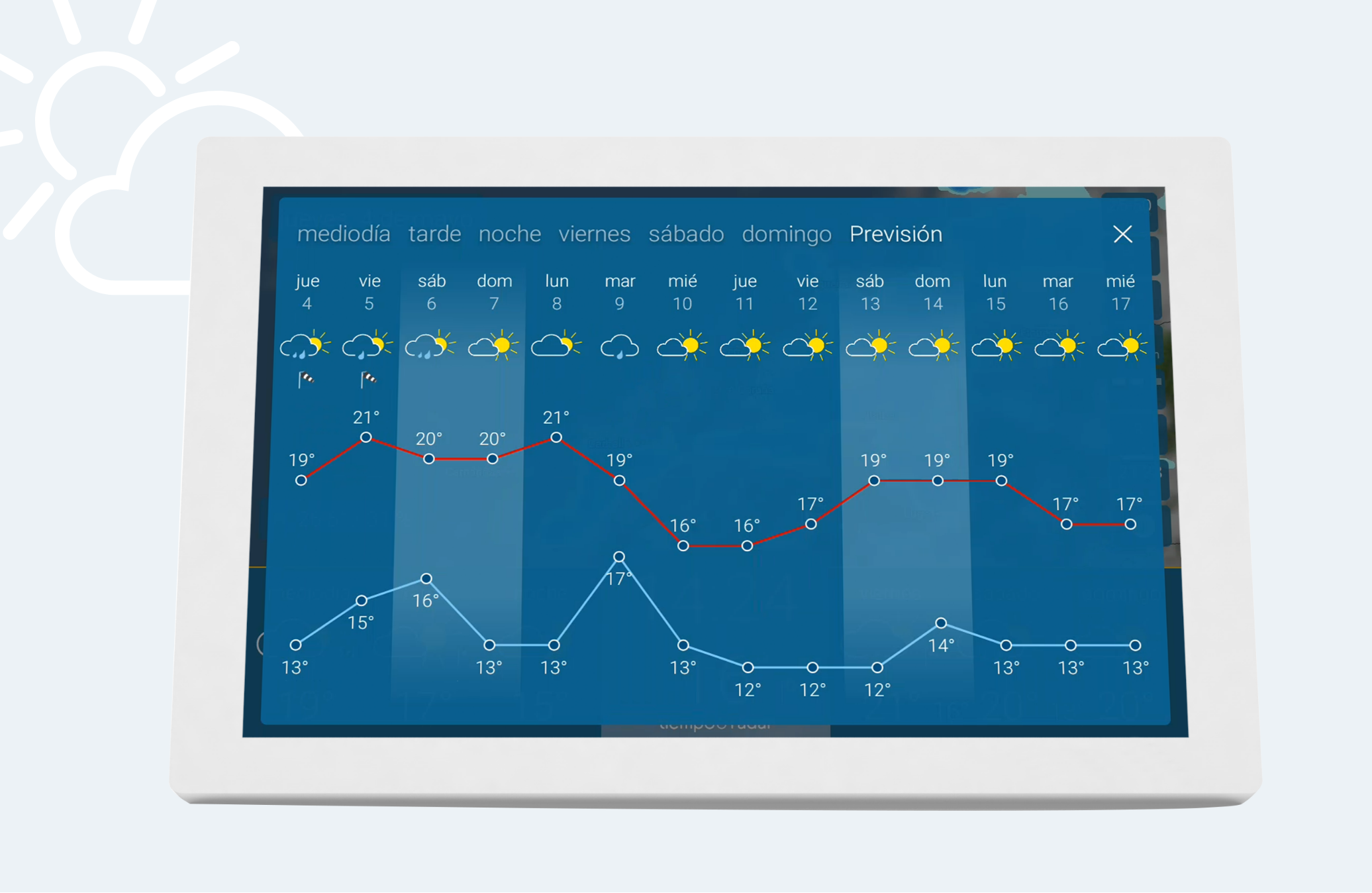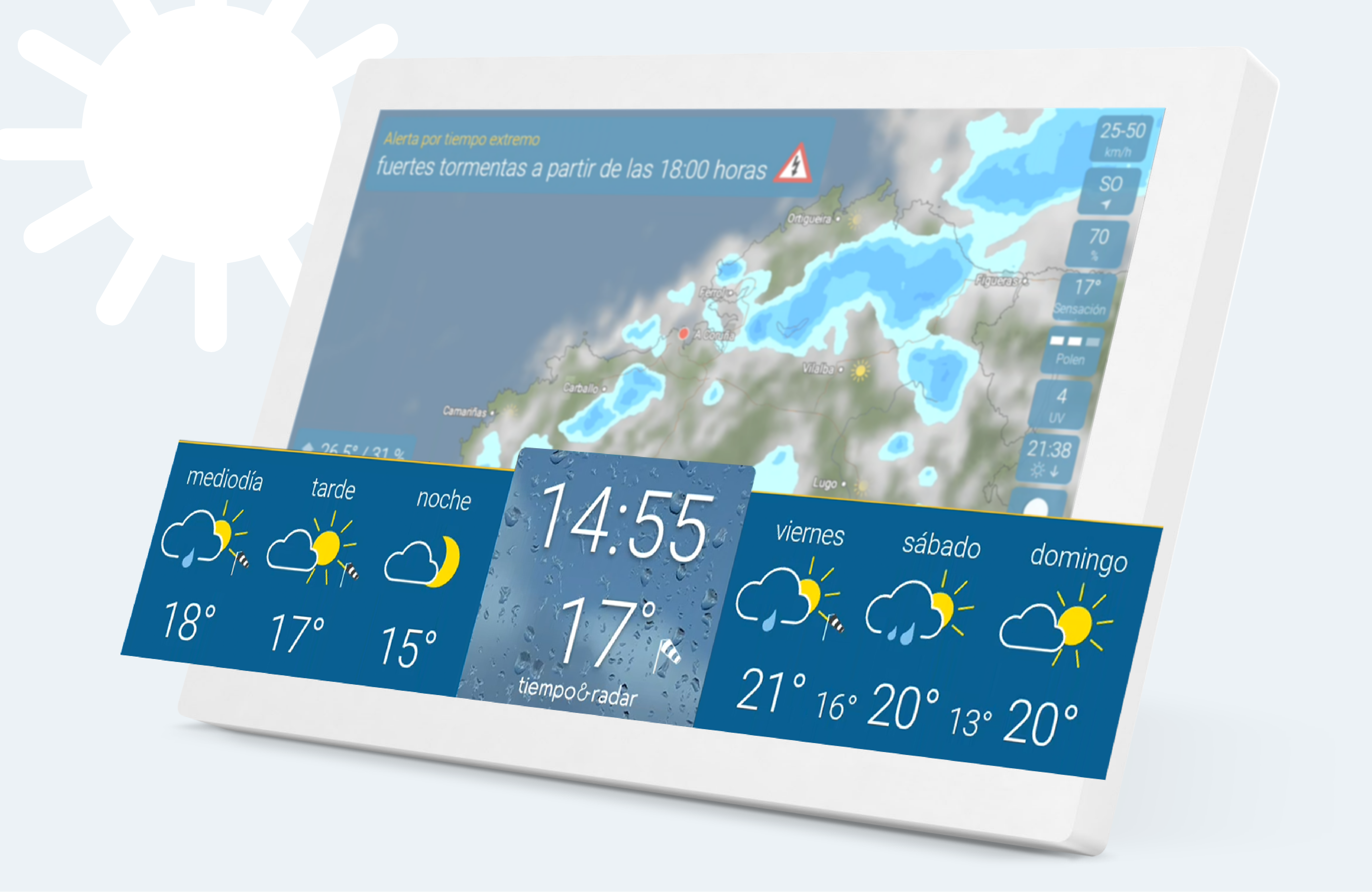 La parte inferior de la pantalla te muestra de manera clara y estructurada el tiempo diario a la izquierda y la tendencia meteorológica para los próximos días a la derecha. La hora y la temperatura actual se muestran en el centro.