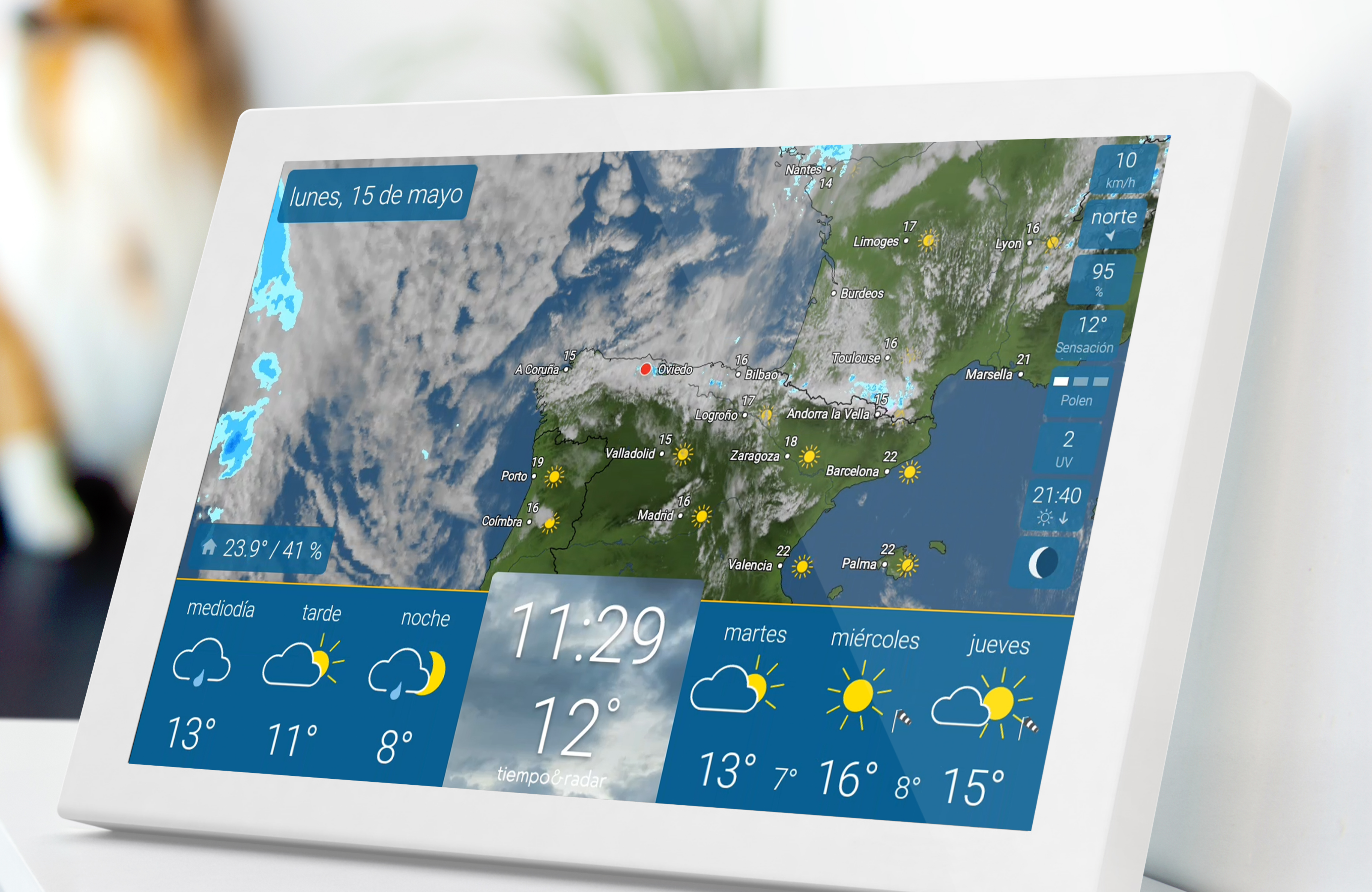 El nuevo sensor de interior contribuye a crear un clima agradable en tu hogar. La información sobre la temperatura y la humedad puede ayudar, por ejemplo, a calentar y ventilar eficazmente. Además, los alérgicos disponen ahora de información aún más detallada sobre os niveles de polen. Esto facilita la planificación a corto y largo plazo. El índice UV se muestra ahora no sólo para el día en curso, sino también para los seis días siguientes. Los niveles van de "bajo" a "extremo" y dan una indicación de las medidas que deben tomarse para protegerse de los daños de la radiación UV.