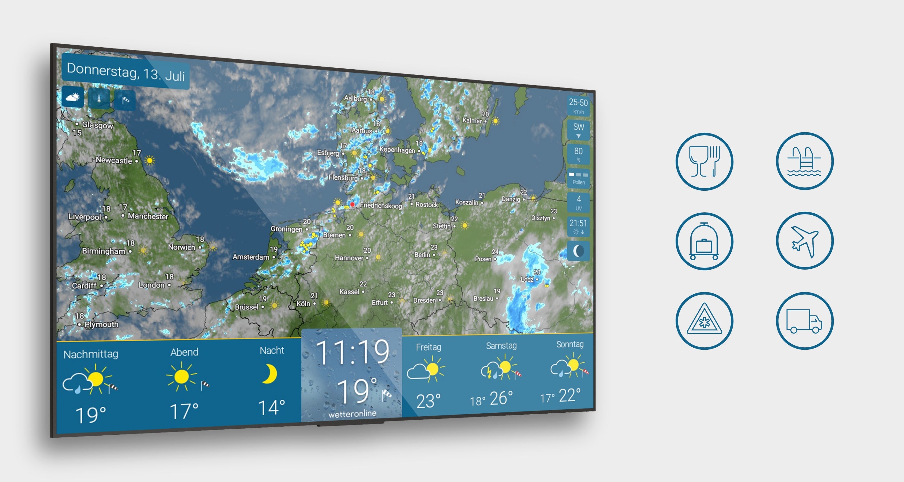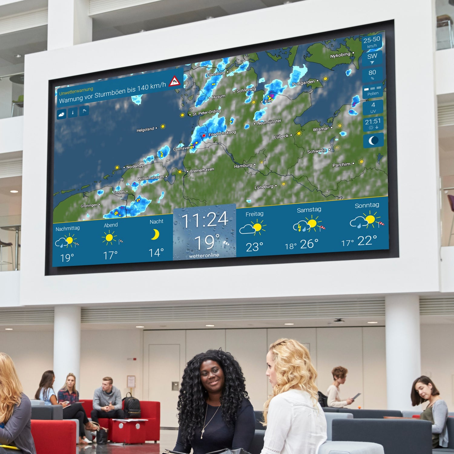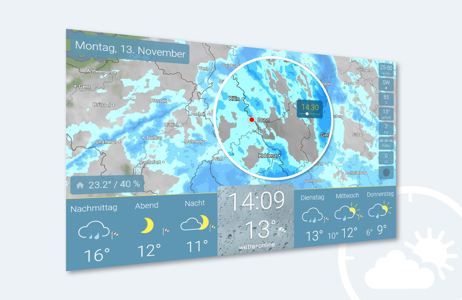 Erfolg kommt nicht aus heiterem Himmel. Wer heute schon weiß, was morgen gefragt ist, kann vorausschauend agieren und spart Zeit, Energie und Ressourcen. Mit wetteronline XXL und wetteronline home lässt sich die Wetterentwicklung im Vorbeigehen checken. Sparen Sie sich aufwendige Recherche und gewinnen Sie Planungssicherheit!Service-Tipp: Informieren Sie Ihre Kunden mit wetteronline home dort, wo sie sich aufhalten. Ob Hotellobby, Restaurant oder Wartebereich.