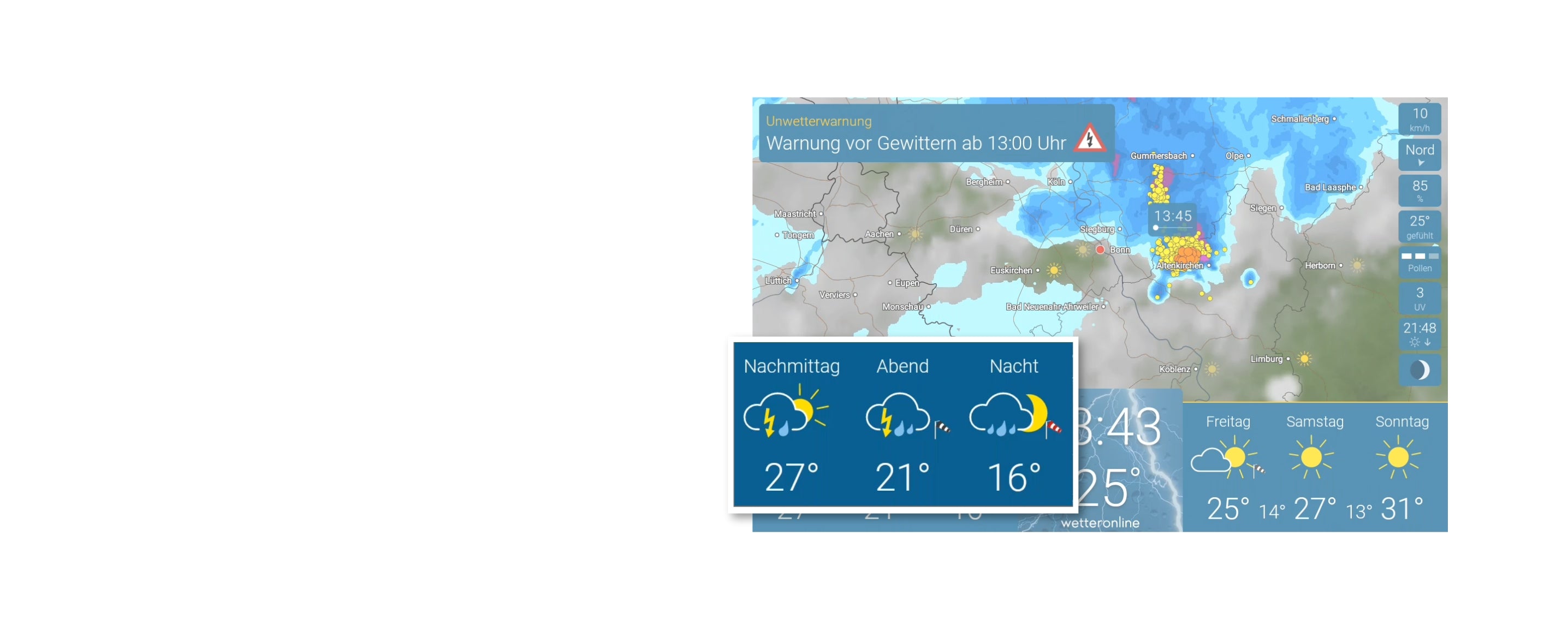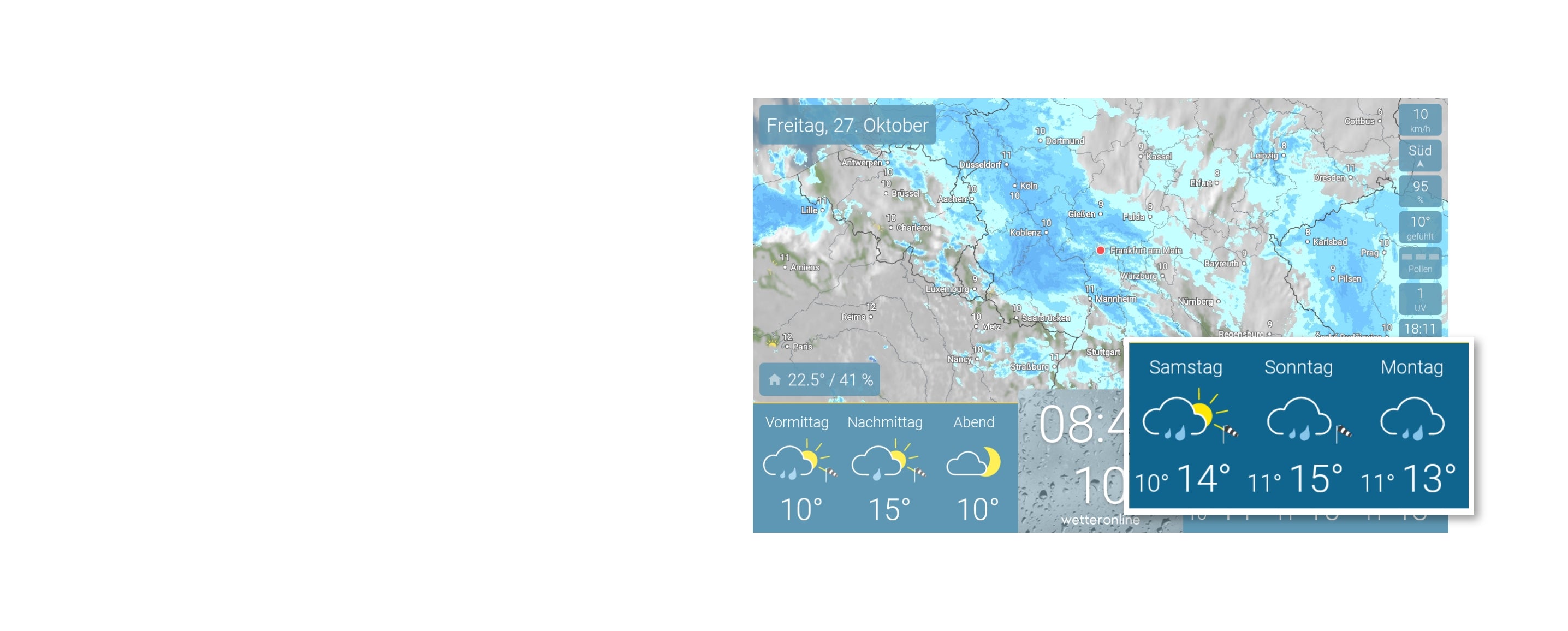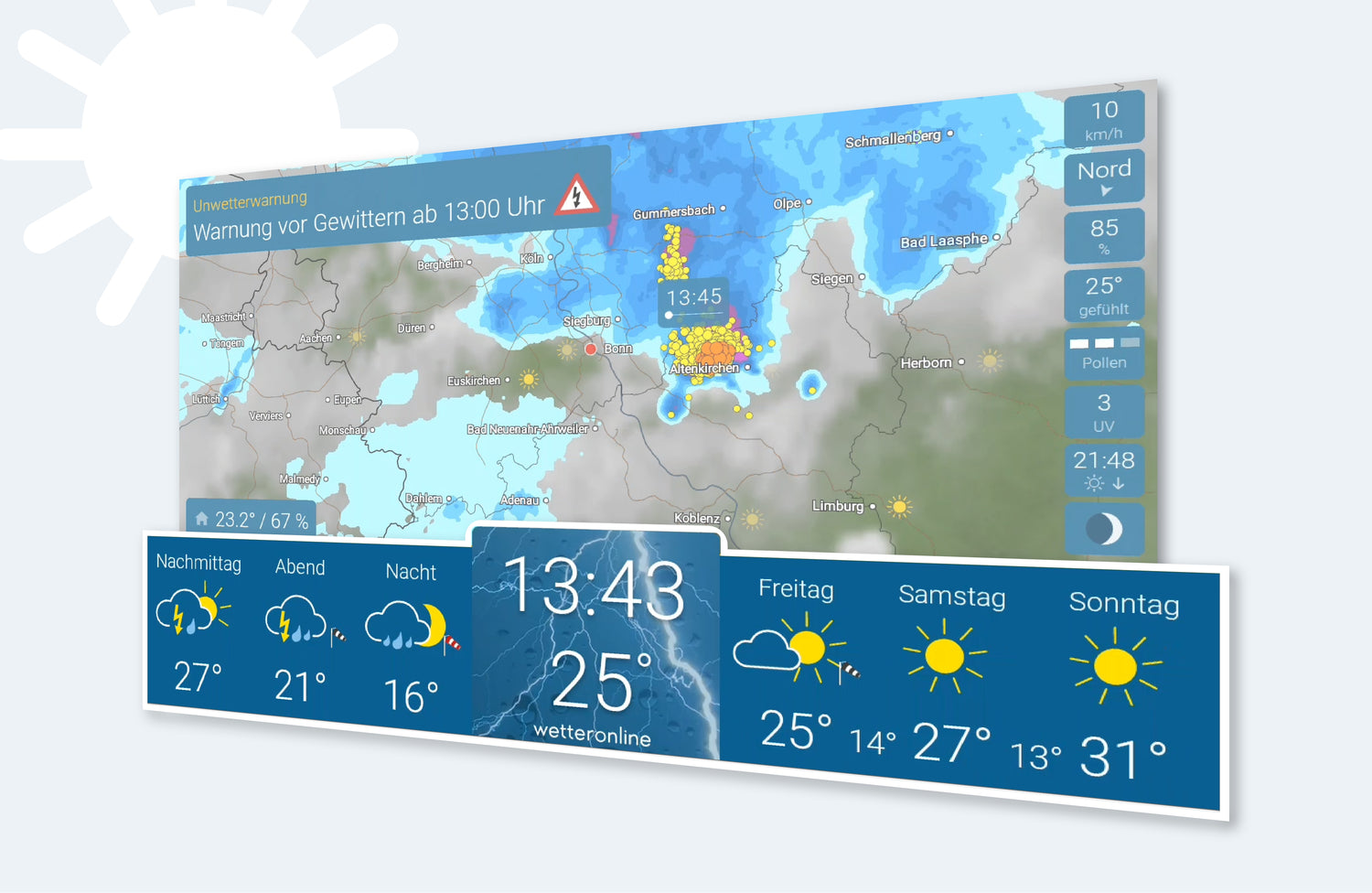 Erfolg kommt nicht aus heiterem Himmel. Wer heute schon weiß, was morgen gefragt ist, kann vorausschauend agieren und spart Zeit, Energie und Ressourcen. Mit wetteronline XXL und wetteronline home lässt sich die Wetterentwicklung im Vorbeigehen checken. Sparen Sie sich aufwendige Recherche und gewinnen Sie Planungssicherheit!Service-Tipp: Informieren Sie Ihre Kunden mit wetteronline home dort, wo sie sich aufhalten. Ob Hotellobby, Restaurant oder Wartebereich.