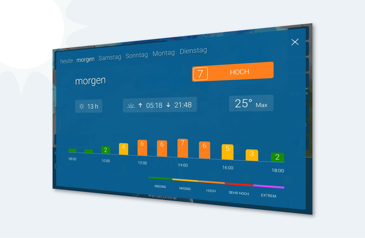 Informationen über die Strahlungsintensität geben einen Hinweis darauf, welche Schutzmaßnahmen Sie aktuell und in den kommenden fünf Tagen ergreifen sollten.