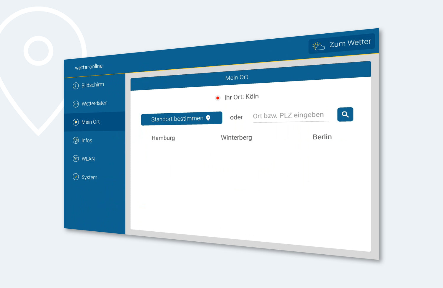 Bei Inbetriebnahme des Gerätes, wird Ihr Standort automatisch ermittelt. Wenn Sie möchten, können Sie hier im Menüpunkt „Mein Ort“ einen anderen Standort eingeben, der nicht Ihrem aktuellen Aufenthaltsort entspricht. Auch die Rückkehr zur automatischen Standortbestimmung ist hier jederzeit möglich.