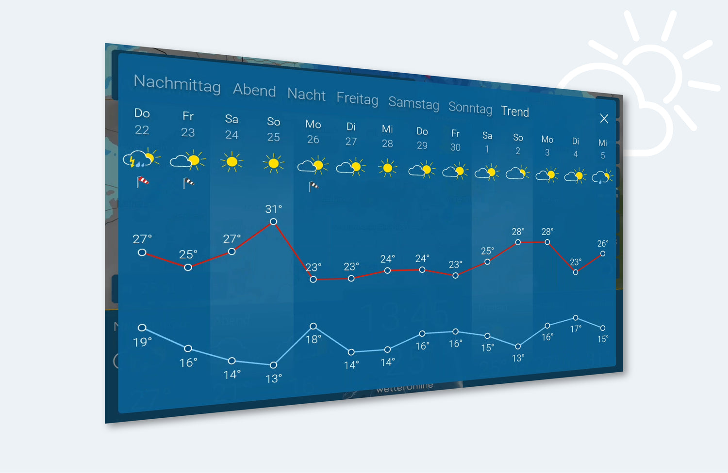 Wählen Sie in der Intervallansicht des Vorhersagetages den Menüpunkt „Trend“ und sehen Sie den Wettertrend der nächsten 14 Tage mit Temperaturverlauf.