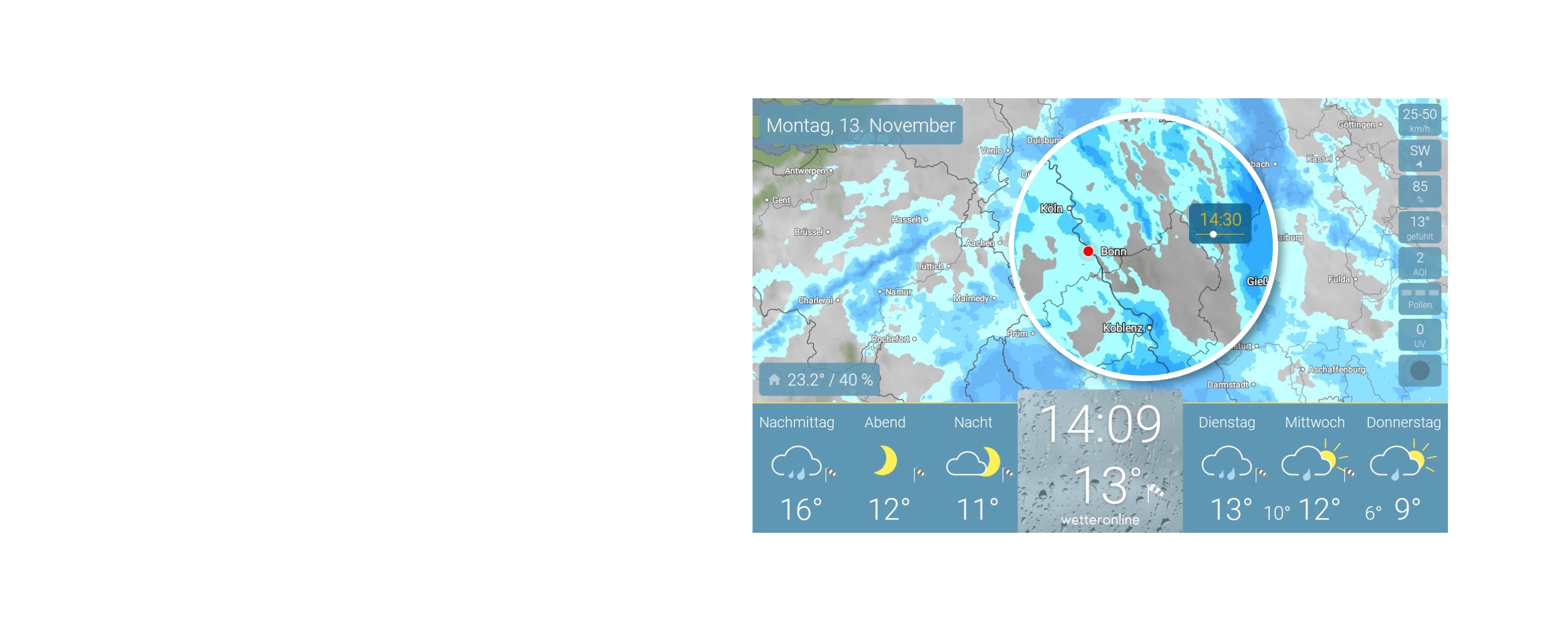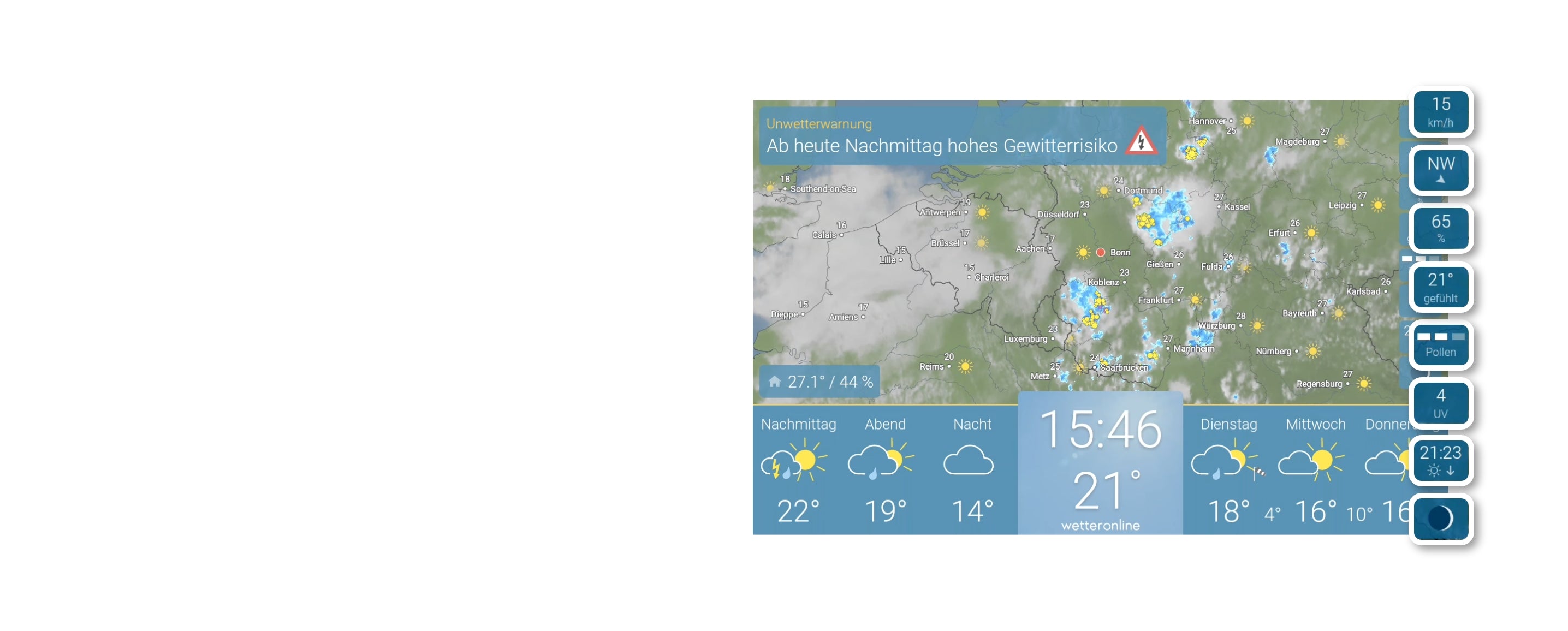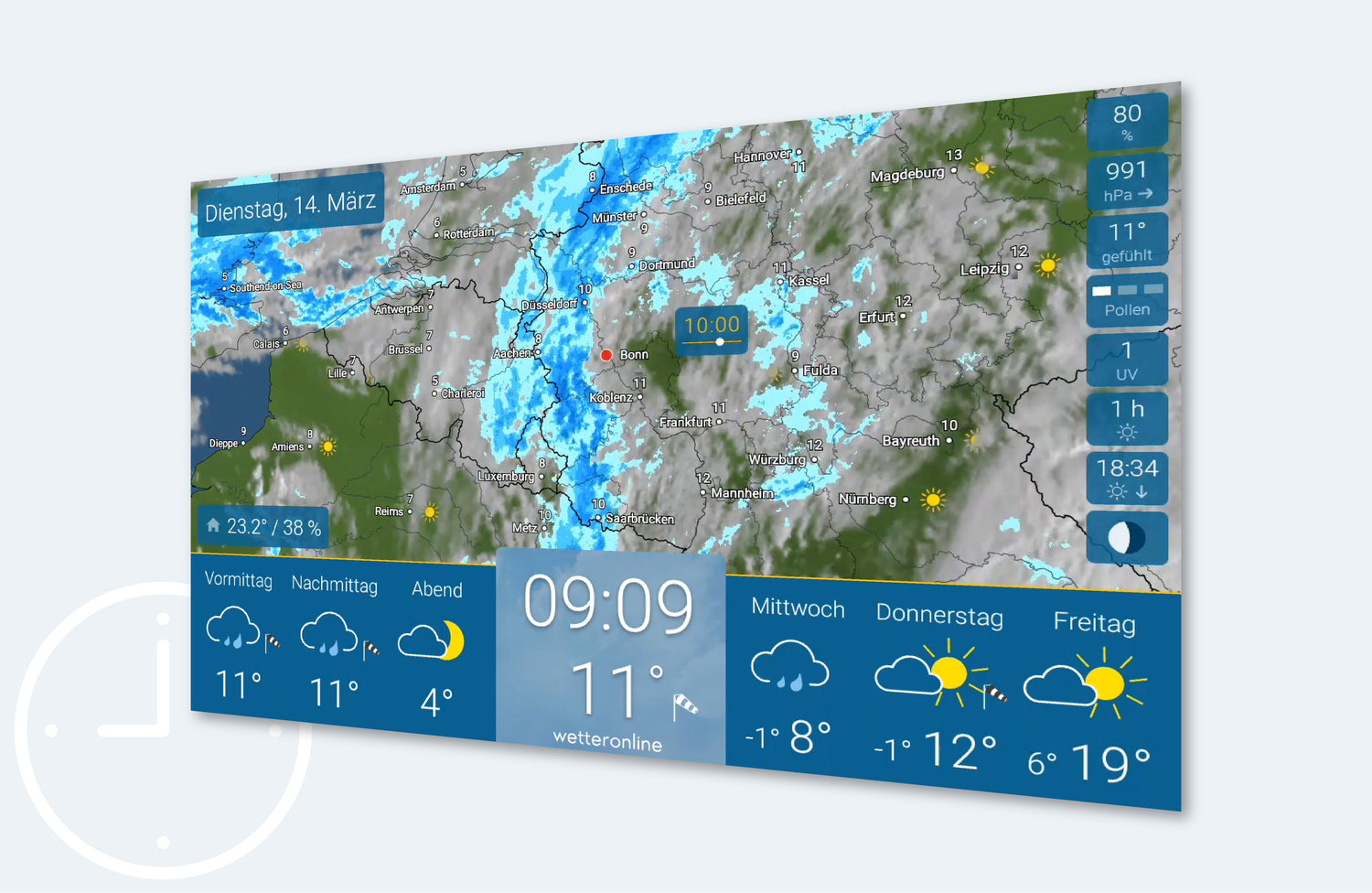 wetteronline XXL und wetteronline home 3 sind für den Dauerbetrieb konzipiert. Individualisierbare Nutzungszeiten, automatisches Abrufen der Wetterdaten und Installieren von Softwareupdates machen die die Lösungen von WetterOnline besonders benutzerfreundlich. Die neusten Informationen zum Wetter sind stets auf einen Blick zu sehen und helfen bei Ihrer Tagesplanung.