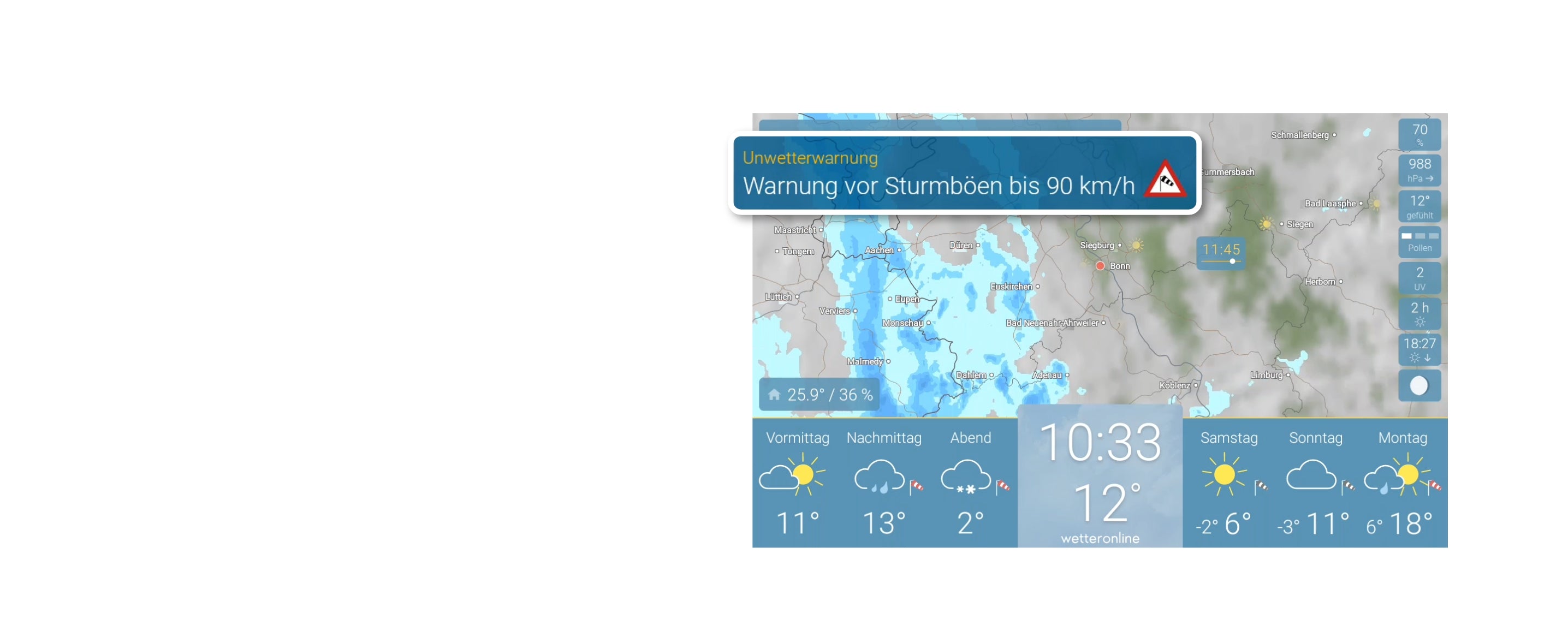Der untere Bildschirmbereich zeigt Ihnen übersichtlich und klar gegliedert links das Wetter im Tagesverlauf und rechts den WetterTrend der kommenden Tage. In der Mitte werden die Uhrzeit und die aktuelle Temperatur angezeigt.